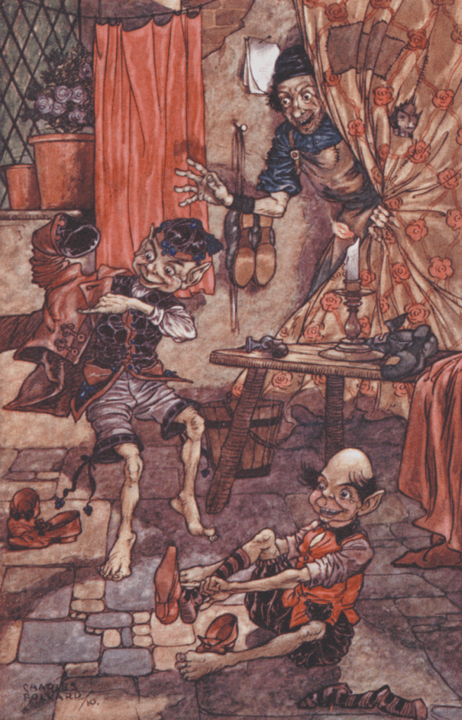 “Un calzolaio, senza sua colpa, era diventato così povero che non gli restava altro se non un pezzo di cuoio per fabbricare un paio di scarpe. Le tagliò di sera per farle il giorno dopo; e siccome aveva la coscienza pulita, andò tranquillamente a letto, si raccomandò a Dio e si addormentò. Al mattino, dopo aver detto le sue preghiere, volle mettersi al lavoro; ed ecco che le scarpe erano sulla tavola bell’e pronte.”