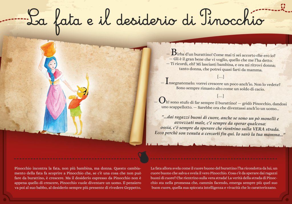 La fiaba non termina qui, a sua volta la Fata lascia a Pinocchio una nuova ipotesi: riconoscersi figlio per essere felice!